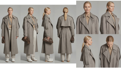 We generate the AI character that corresponds to the ideal casting, proxy actor, or chosen presenter for whom we have rights — produced full body in frontal, three-quarter, profile, and back views. We also produce a grid for the face showing frontal, profile, three-quarter, and overhead angle views, giving us the jawline. The character is dressed in the clothing required for the piece. If the clothing is made from a special material, this is specified in the text prompt.